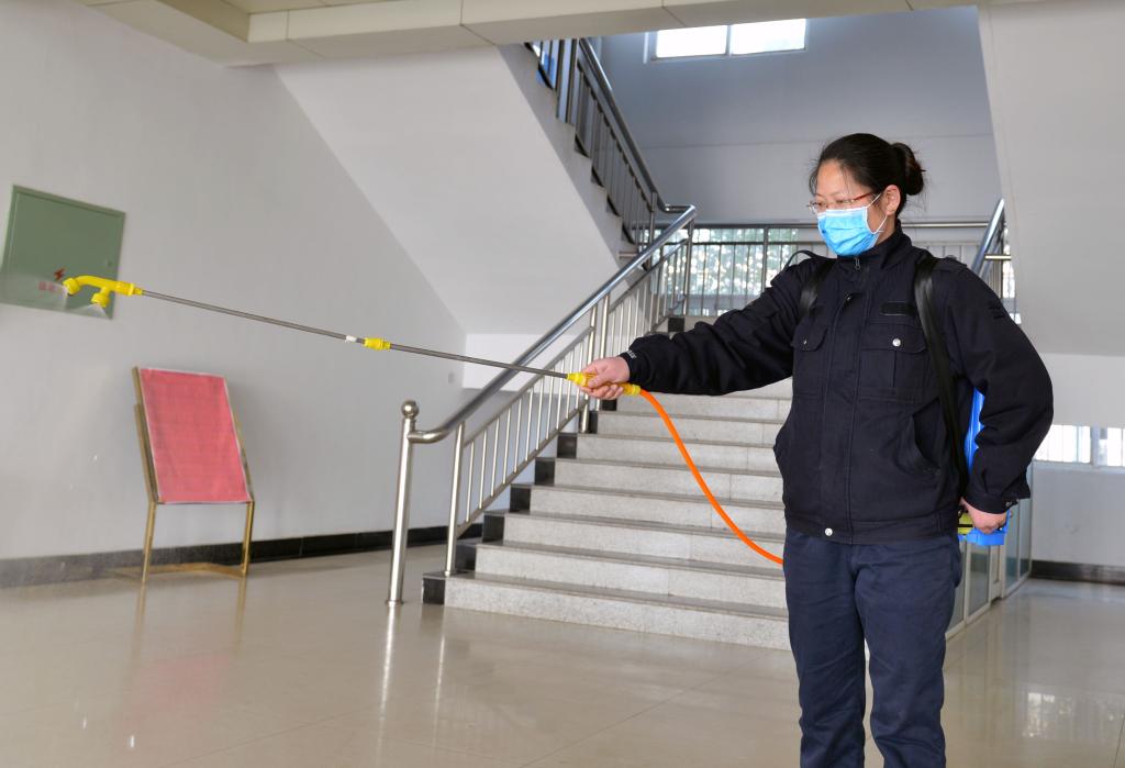“早上7点多,职工师傅们就开始来上班了,我们必须抢在前面消毒,不能想着暖和一些晚一会再干活……”四十斤的消毒液喷雾筒背在这些女职工柔弱的肩上,看上去走路都有些吃力,别提再爬楼梯了。