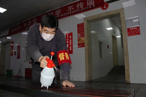 该矿物业科卫生队党员刘洋,背着喷雾器每4小时一次对办公楼走廊、职工宿舍、卫生间及所属岗位进行消毒,对食堂等关键重点场所每日不少于3次消毒。(王亮 陈更)