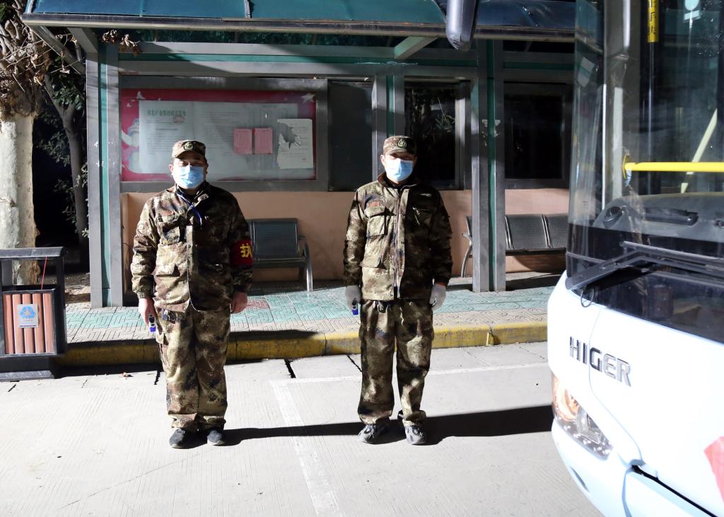 上图2月2日凌晨5:20,为曹辉(左一)和队员在通勤车前,等待为职工测量体温
