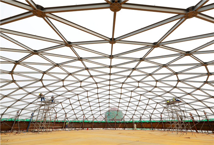 碳鑫科技公司20000立方米的乙醇成品罐,正进行罐顶部网壳拼装。王明明摄