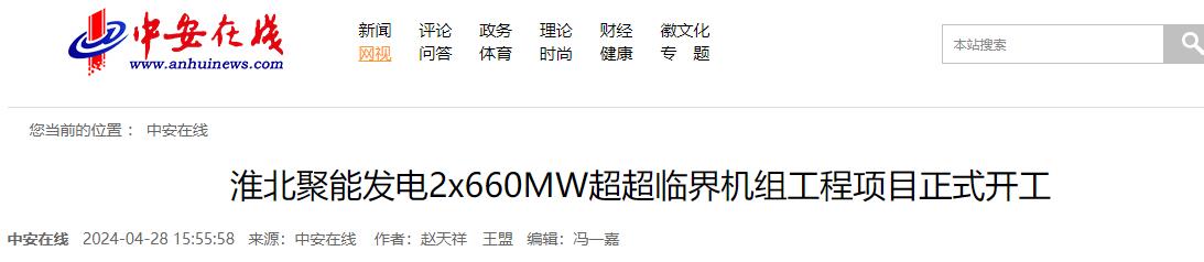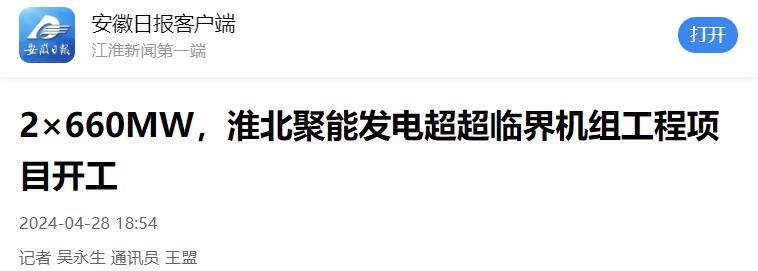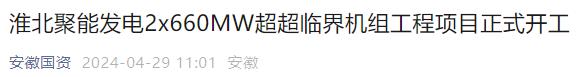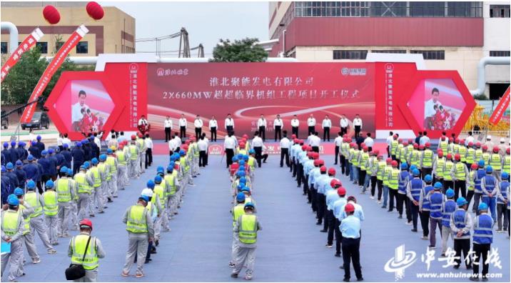 4月28日,安徽省“十四五”重要支撑性电源项目淮北聚能发电有限公司2×660兆瓦超超临界机组工程项目在淮北市烈山区电厂现场举行开工仪式。