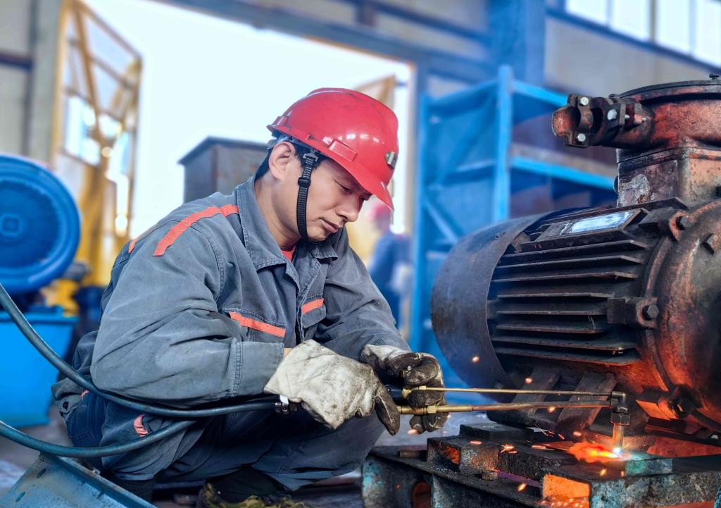 图为该矿机电科(机厂)职工曹辉正在切割加工材料。