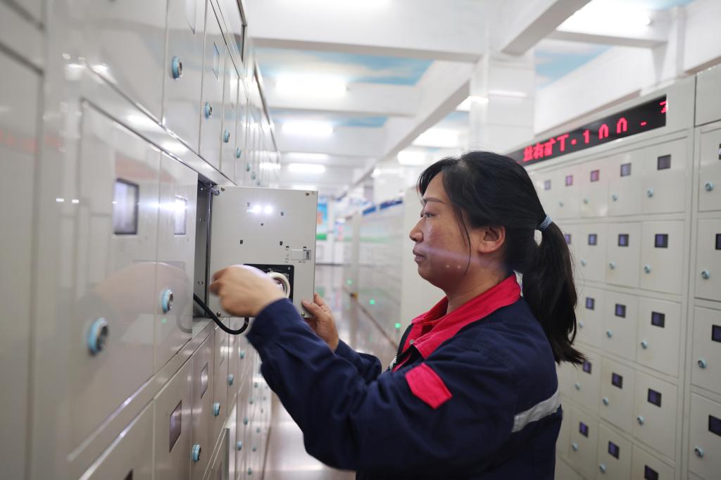 该矿保运区35KV变电女工谢妍妍、张海玲进行岗位操作。