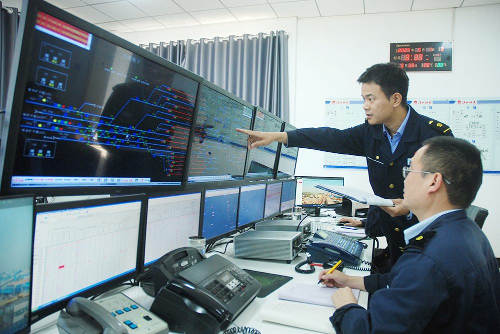 图为湖集中心站行车室主任王迪现场盯控运输组织作业
