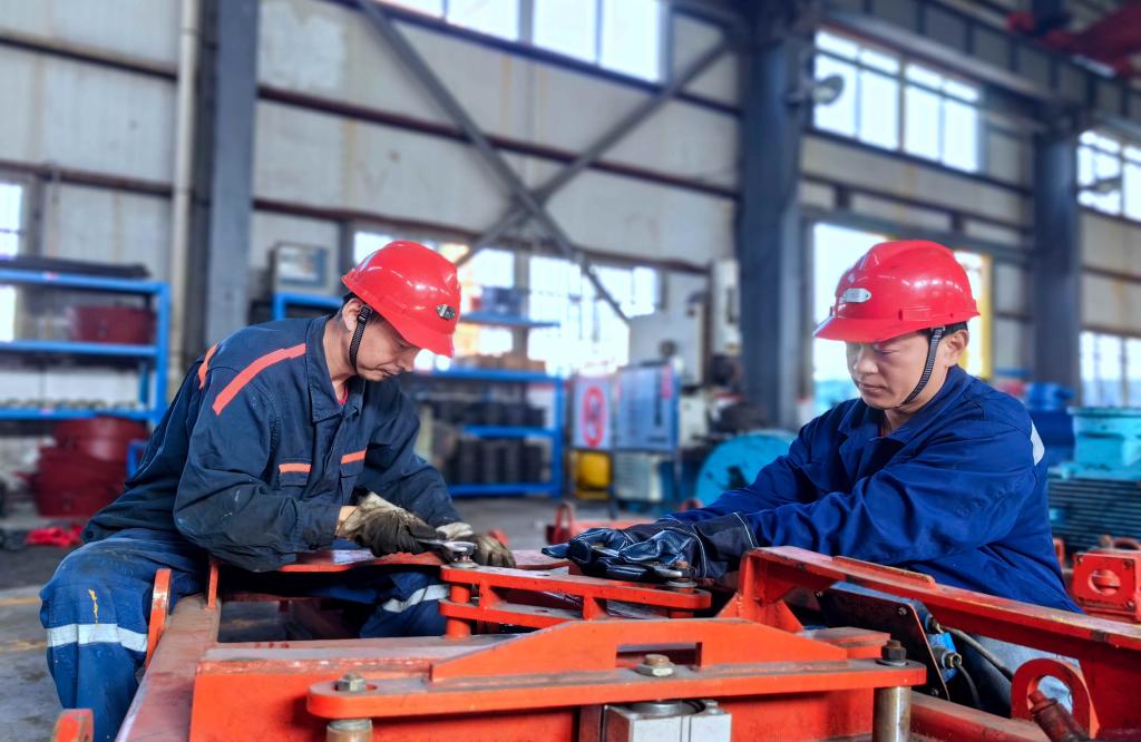 图为机电科机修工胡天彬和戴铁锤正在维修单轨吊气动道岔