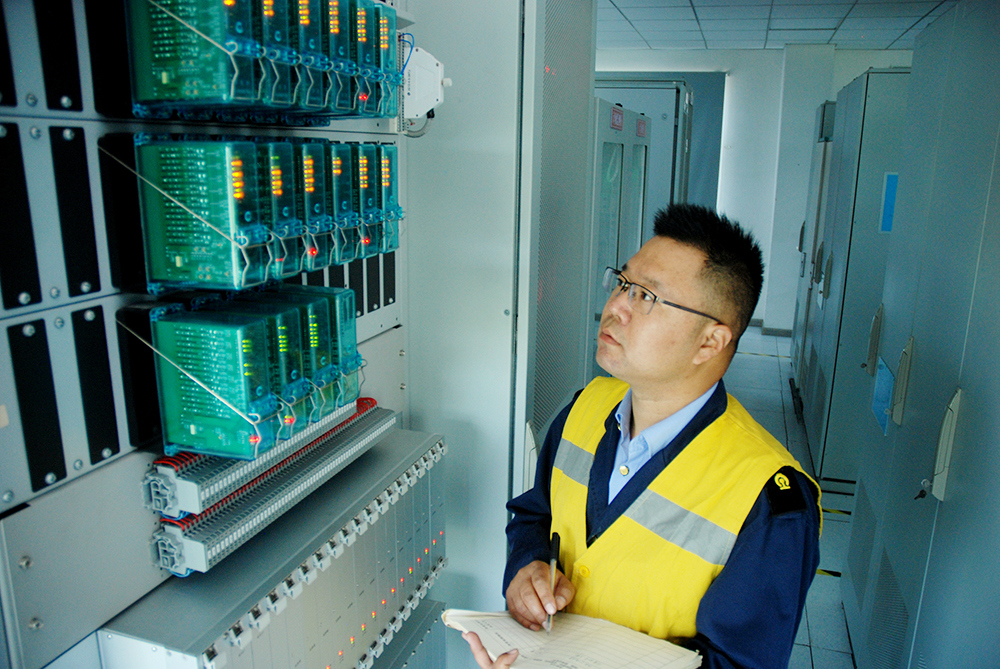 图为临涣电务段信号领工区领工长石磊查看信号联锁机房信号集中监测系统运行情况