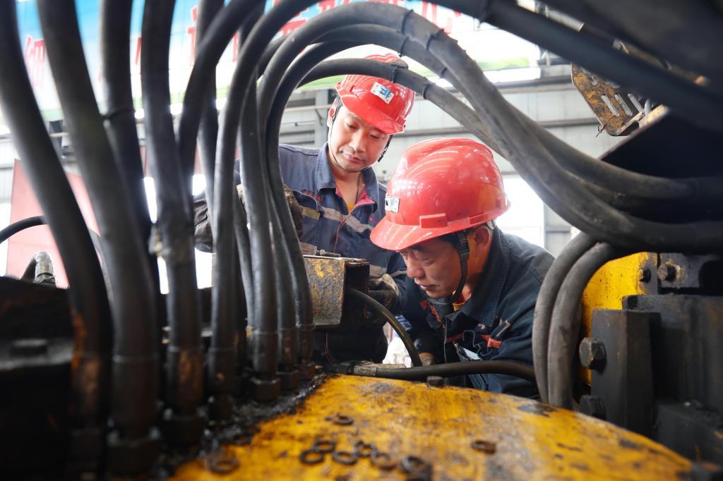 图为该矿机电科(机厂)职工陈兴开、徐辉正在维修井下挖掘机。