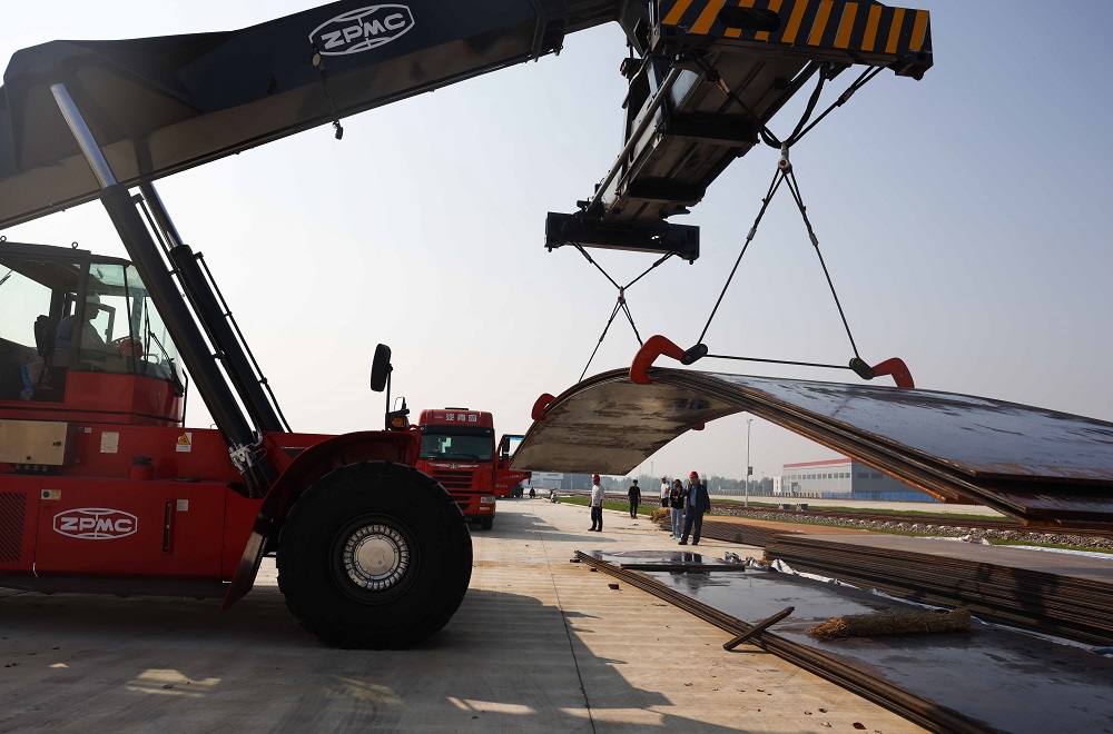 10月11日上午,淮北零碳智慧物流产业园大宗物资作业现场,正面吊运起重机正开足马力,将600吨16至25毫米厚度的大块钢板一次性吊起6至8块,装到排成长队的6轴大货车上。