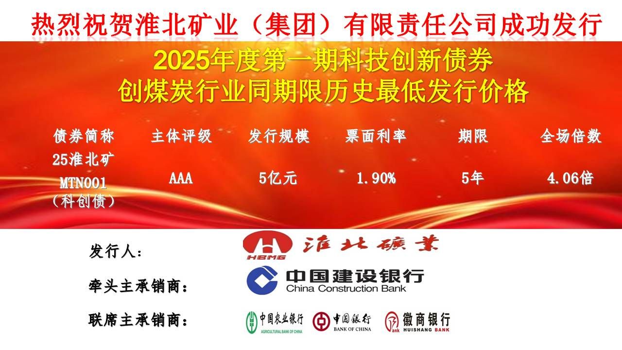 2025年7月8日,英国365集团官网集团在银行间市场成功发行2025年第一期科技创新债券——25淮北矿MTN001(科创债),发行规模5亿元,期限5年,票面利率1.90%,全场认购倍数4.06倍,创煤炭行业同期限债券价格最低、集团债券票面利率新低,充分显示资本市场对英国365集团官网集团科技创新实力和高质量发展前景的坚定信心。