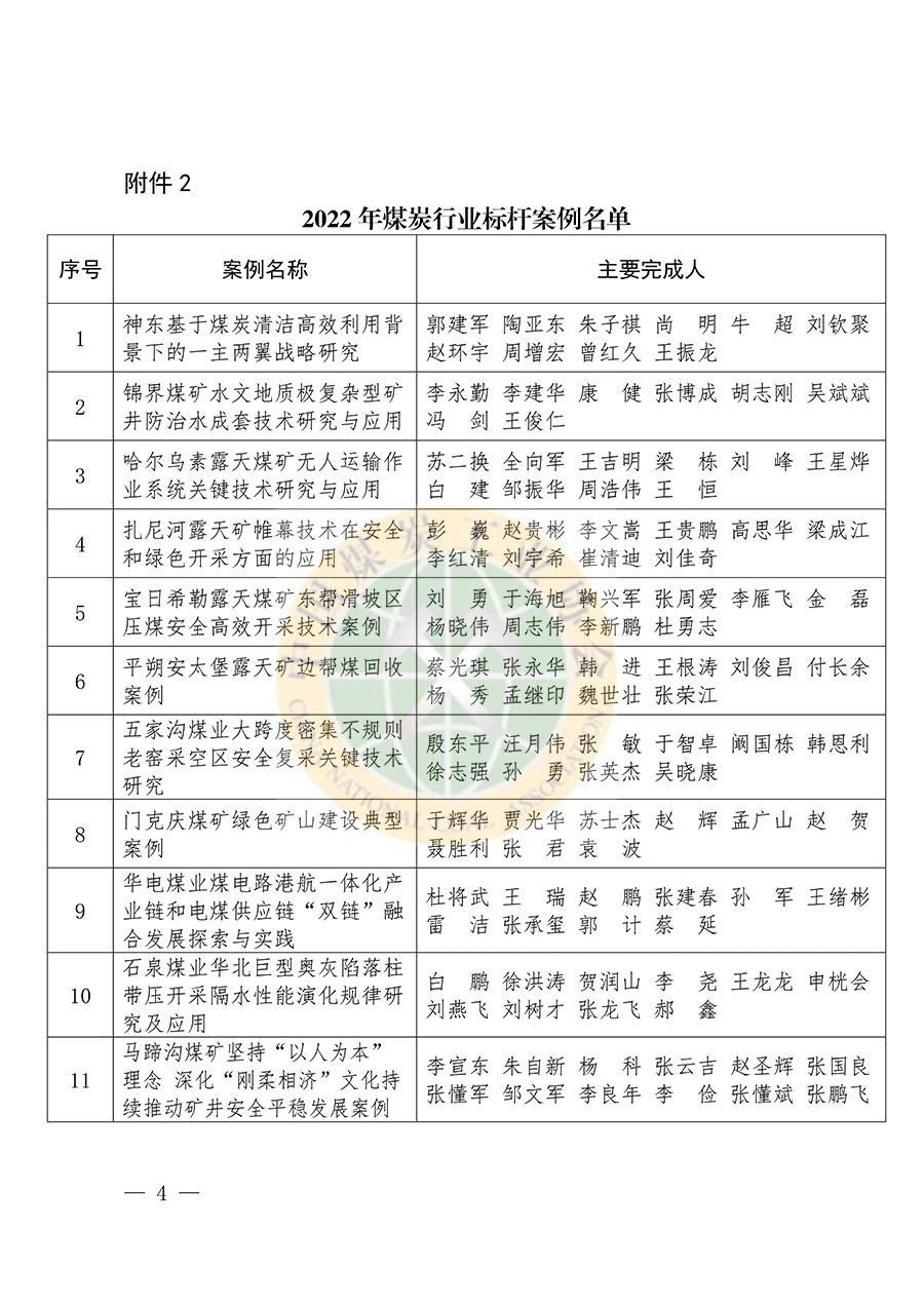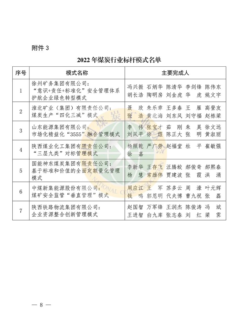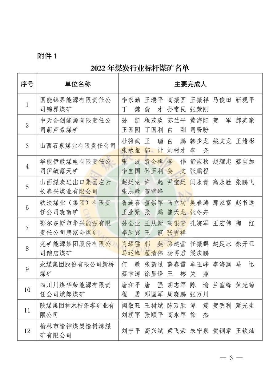 中国煤炭工业协会关于发布2022年煤炭行业标杆煤矿、标杆案例和标杆模式的通知
