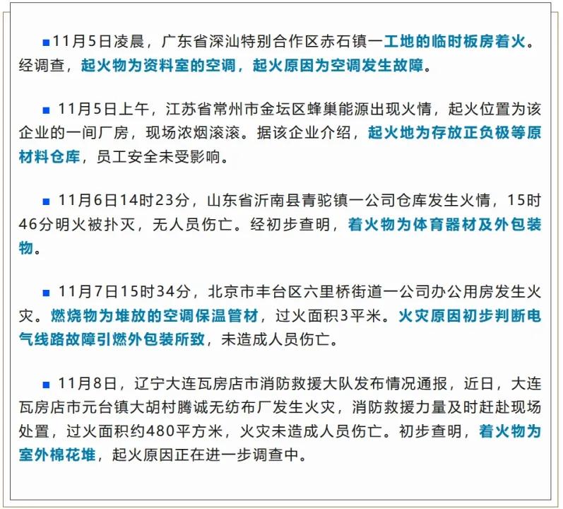 随着冬日到来,气候寒冷、干燥、多风,传统节日、大型活动集中,用火用电用气量增加,火灾呈现易发多发之势。根据有关火灾数据统计,一年中冬季火灾起数占比最大,特别是第四季度生产、经营、建设活动频繁,火灾形势严峻复杂。进入11月以来,多地建筑工地、工厂仓库等生产经营场所接连发生火灾,值得高度警惕!