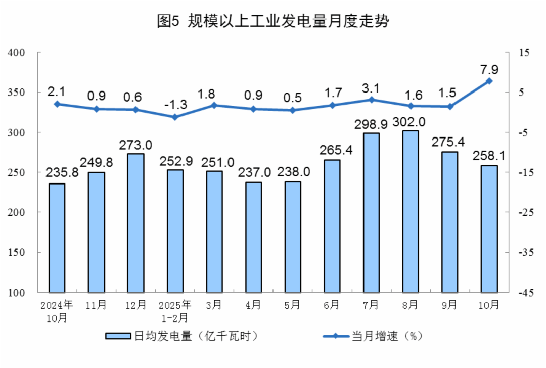 10月份,规上工业发电量8002亿千瓦时,同比增长7.9%,增速比9月份加快6.4个百分点;日均发电258.1亿千瓦时。
